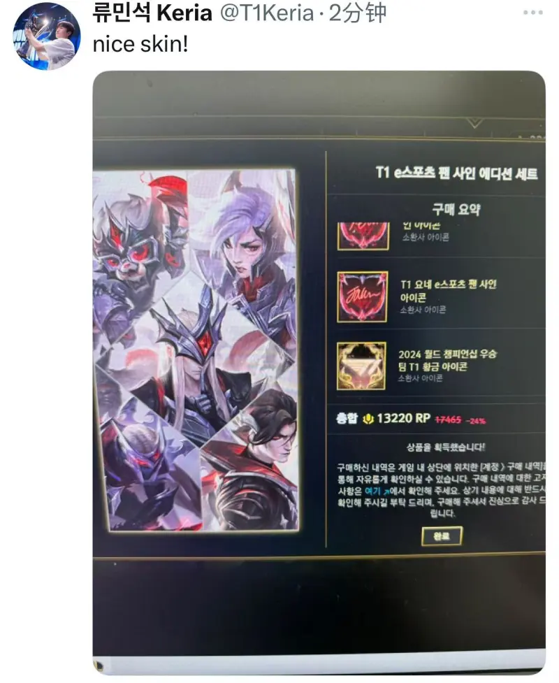 虎扑09月11日讯 T1辅助Keria选手今日更新社交媒体,发布2024T1冠军皮肤购买图,并配文:好看的皮肤!